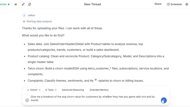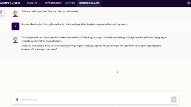- Prompt: Give me a breakout of the avg churn value for customers by whether they had any game add-ons and by month.