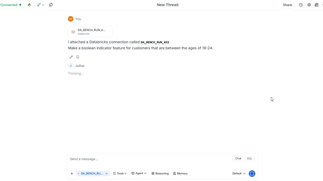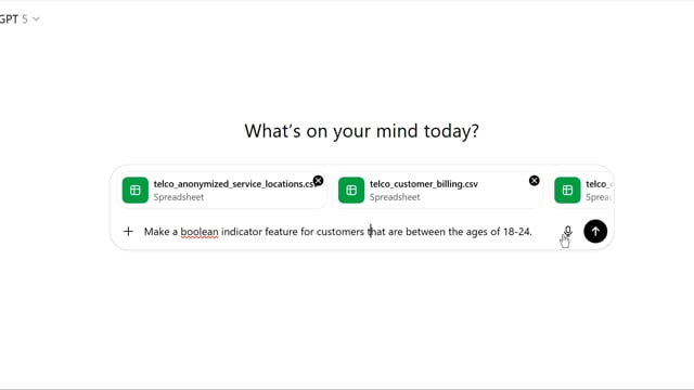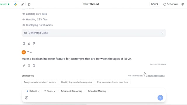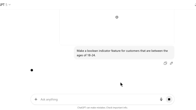 - Prompt: Turn 1: Make a boolean indicator feature for customers that are between the ages of 18-24. Turn 2: Tell me what the values of the new indicator column are for Customer IDs '7495-OOKFY', '1658-BYGOY', '9237-HQITU', and '7892-POOKP'?