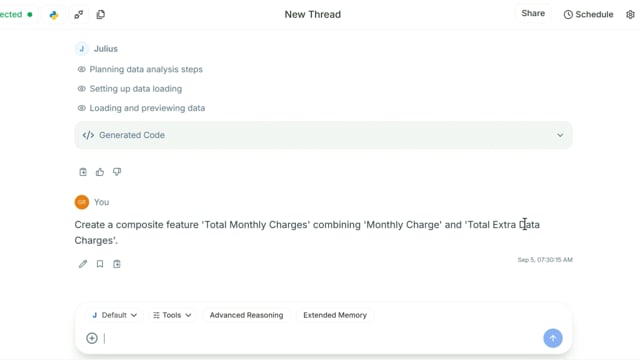 - Prompt: Turn 1: Create a composite feature 'Total Monthly Charges' combining 'Monthly Charge' and 'Total Extra Data Charges'. Turn 2: Tell me what the values of that composite feature are for Customer IDs '8779-QRDMV', '7495-OOKFY', '1658-BYGOY', and '4598-XLKNJ'?