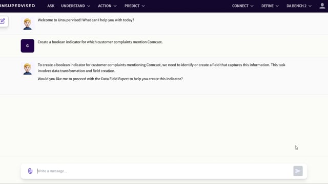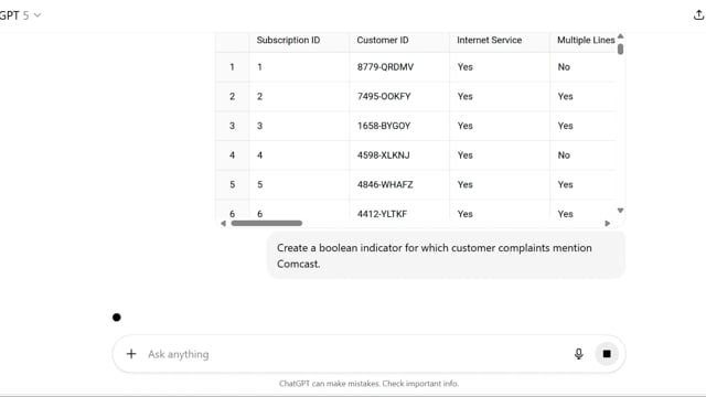 - Prompt: Turn 1: Create a boolean indicator for which customer complaints mention Comcast. Turn 2: Tell me the values of that indicator feature for Ticket IDs '358373', '344657', and '257589'?