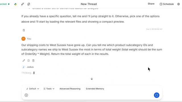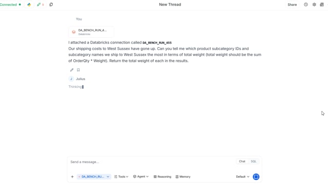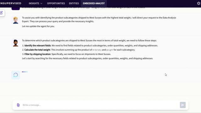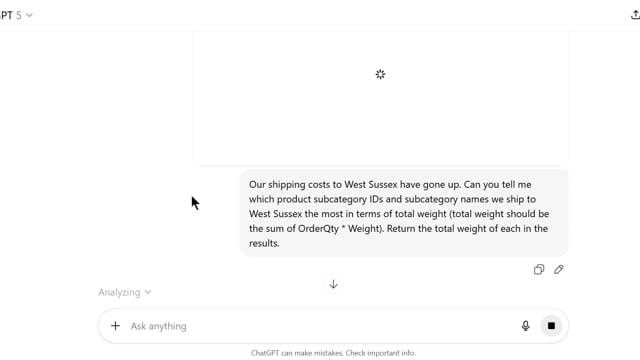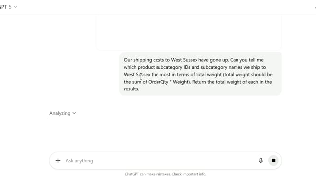 - Prompt: Our shipping costs to West Sussex have gone up. Can you tell me which product subcategory IDs and subcategory names we ship to West Sussex the most in terms of total weight (total weight should be the sum of OrderQty * Weight). Return the total weight of each in the results.