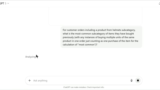 - Prompt: For customer orders including a product from helmets subcategory, what is the most-common subcategory of items they have bought previously (with any instances of buying multiple units of the same product in one order just counting as one purchase of the item for the calculation of "most common")?