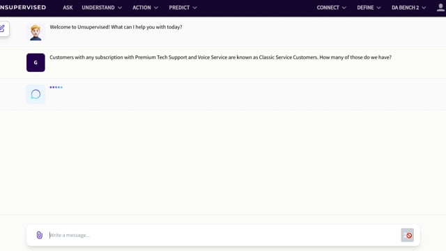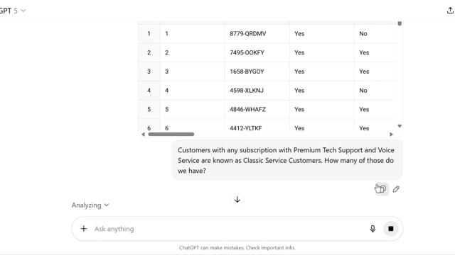 - Prompt: Turn 1: Customers with any subscription with Premium Tech Support and Voice Service are known as Classic Service Customers. How many of those do we have? Turn 2: What is the average churn rate for Classic Service Customers?