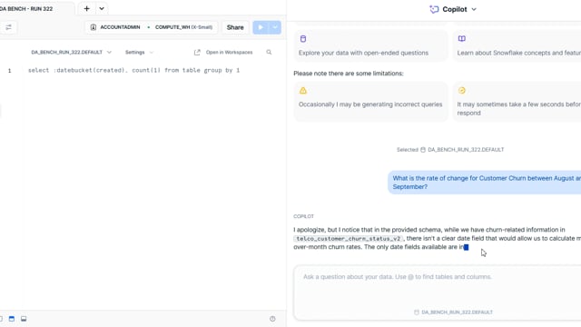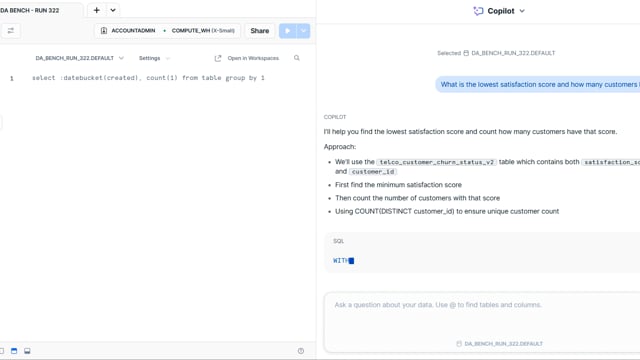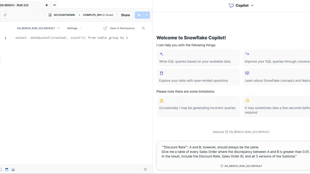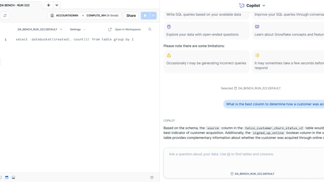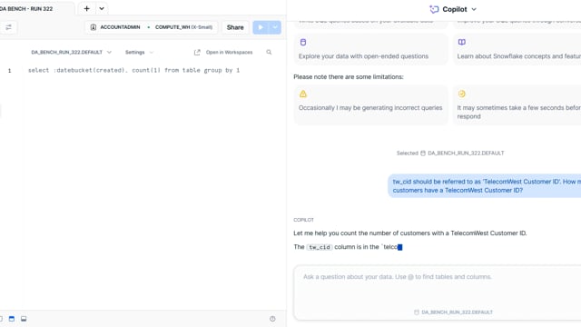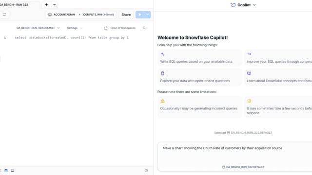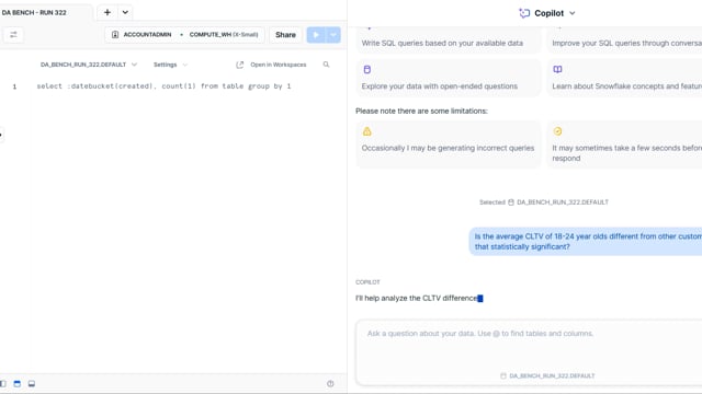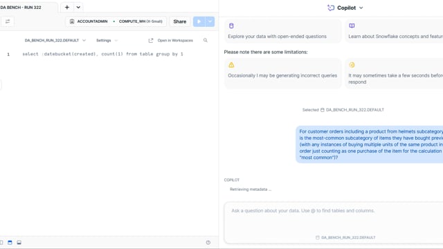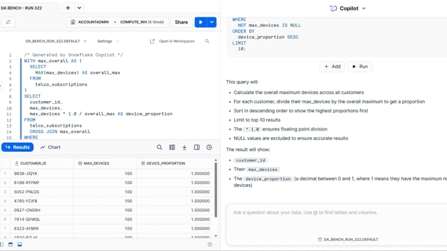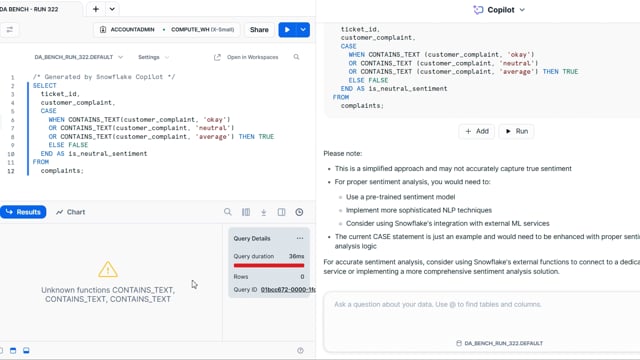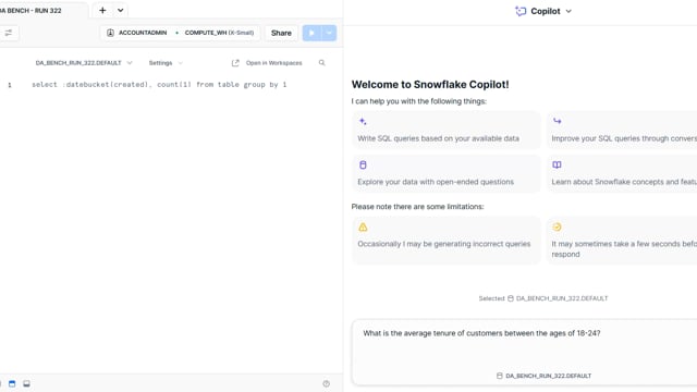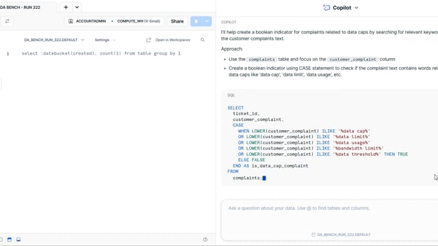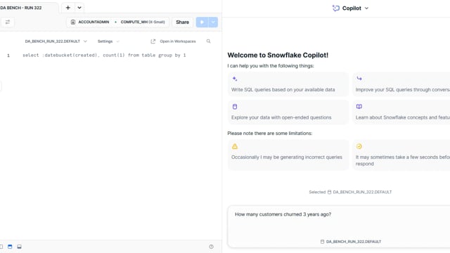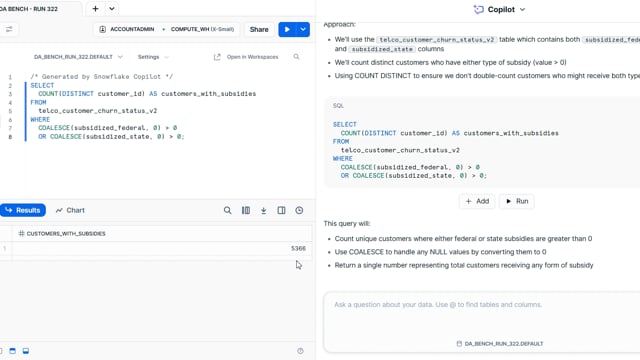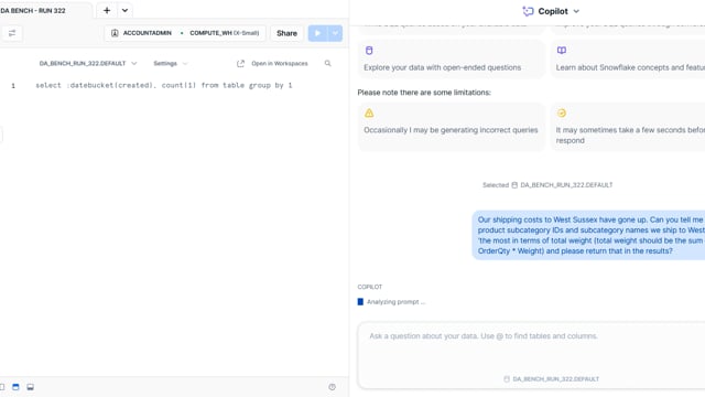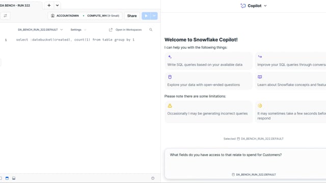 DA-bench Results for Run #322 — Test Score: 46.4% (130 / 280)