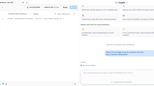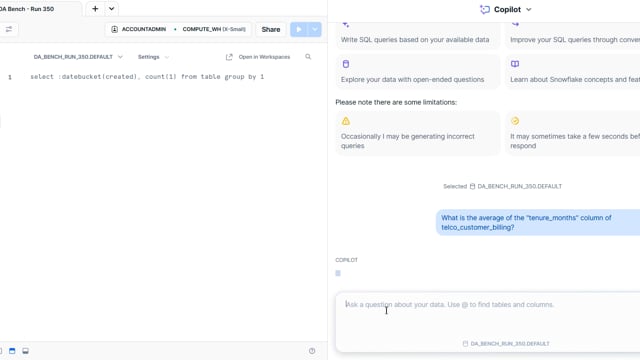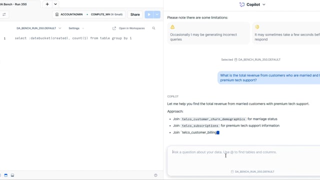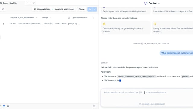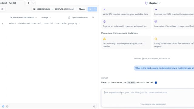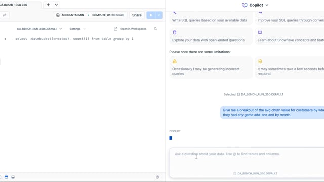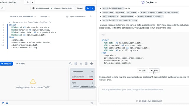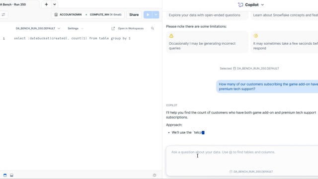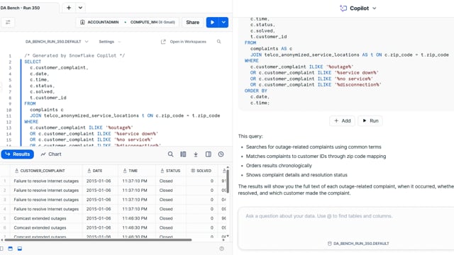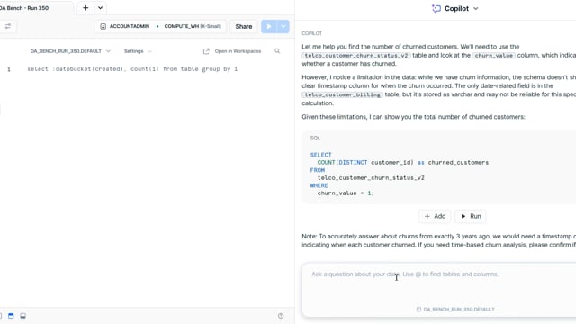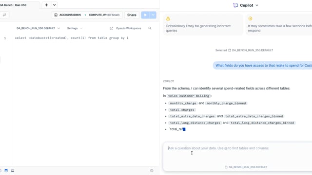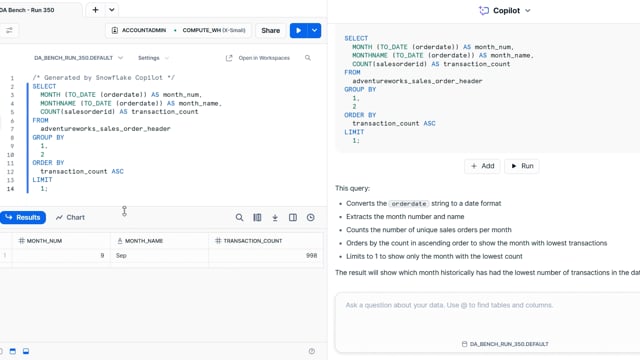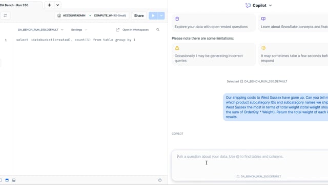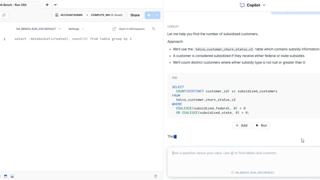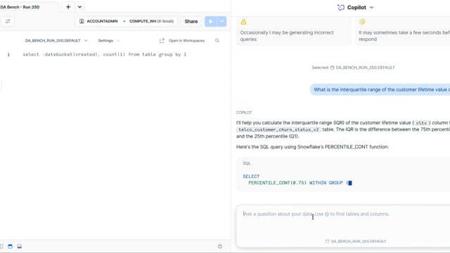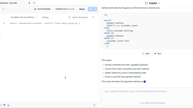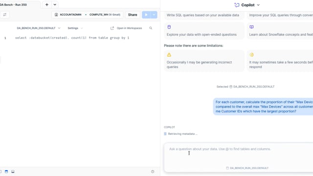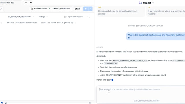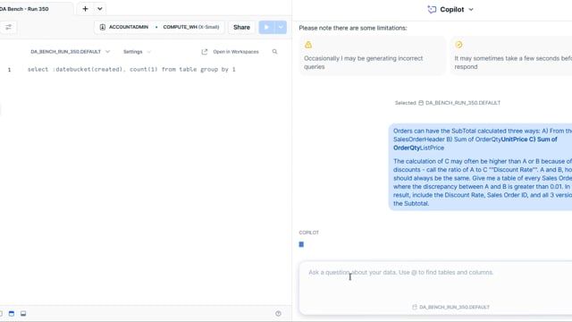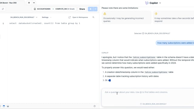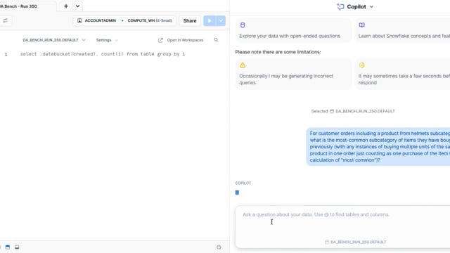 DA-bench Results for Run #350 — Test Score: 51.4% (144 / 280)