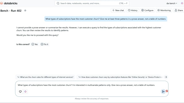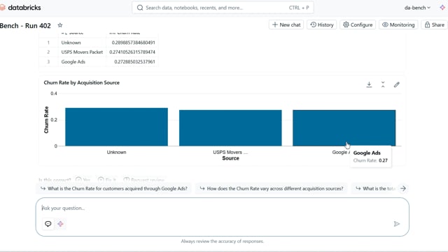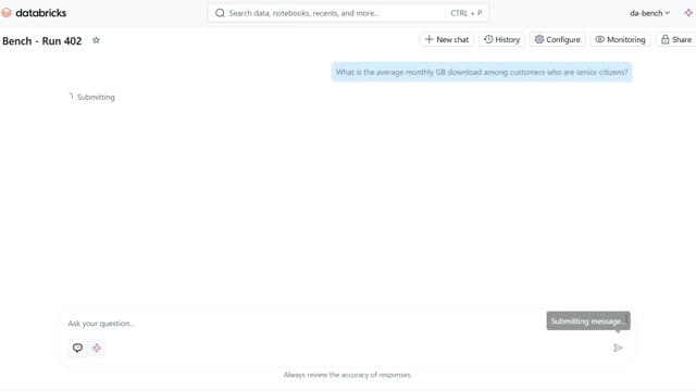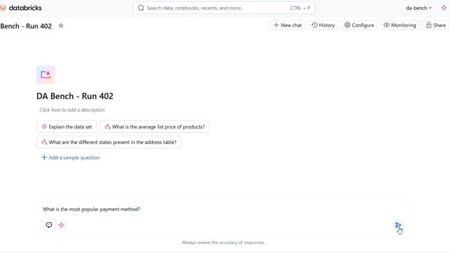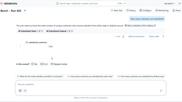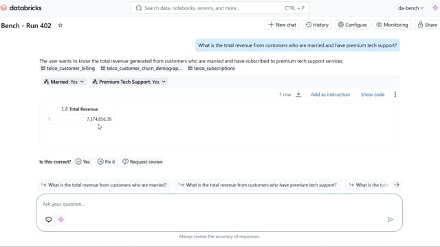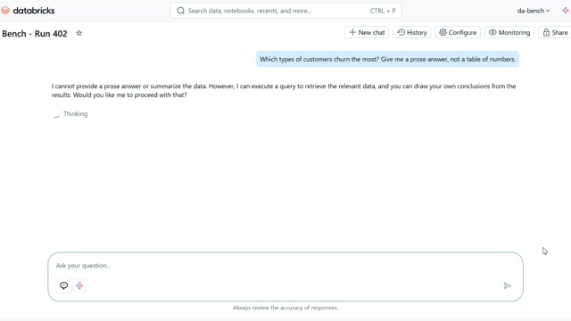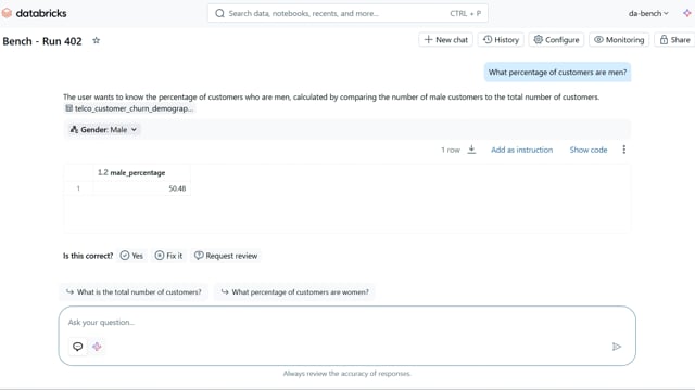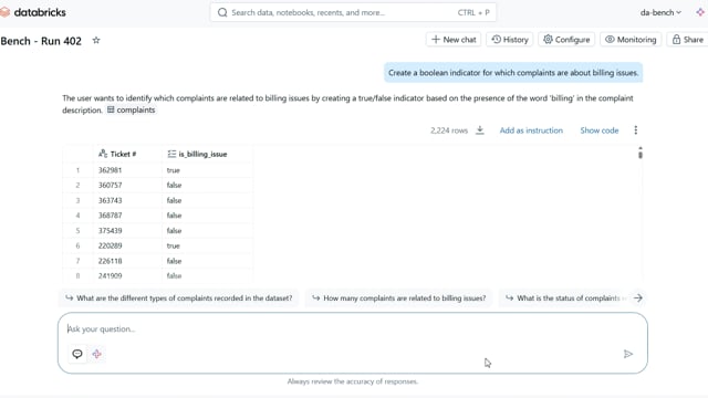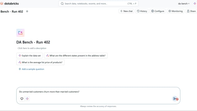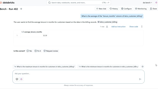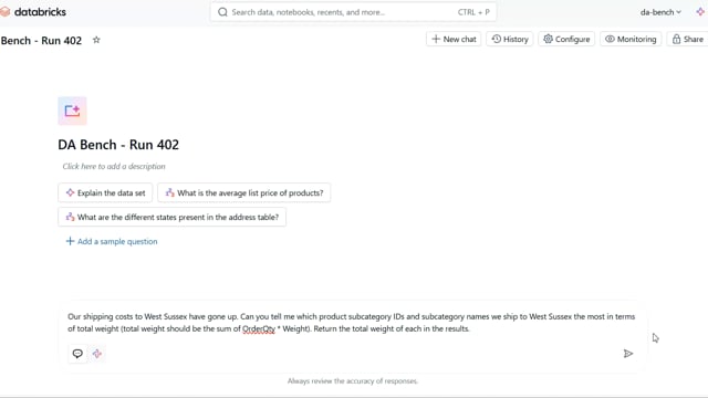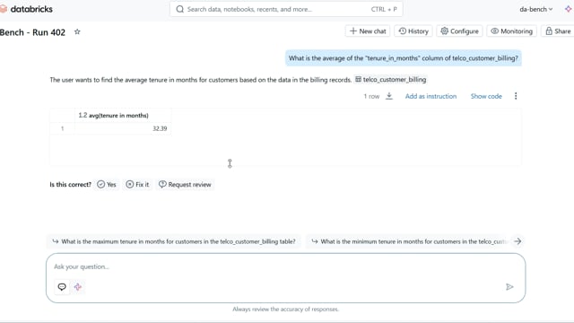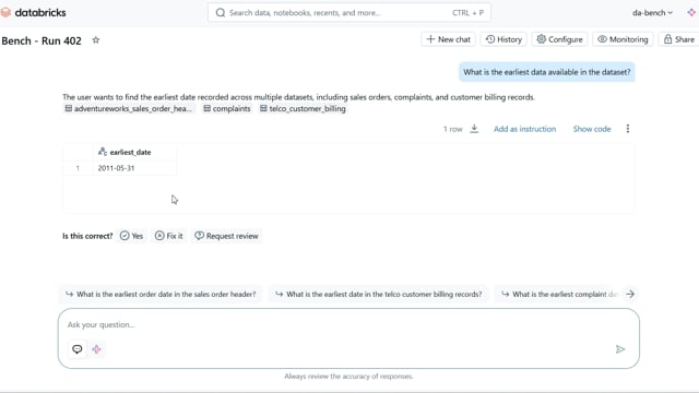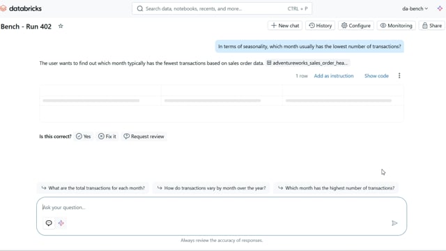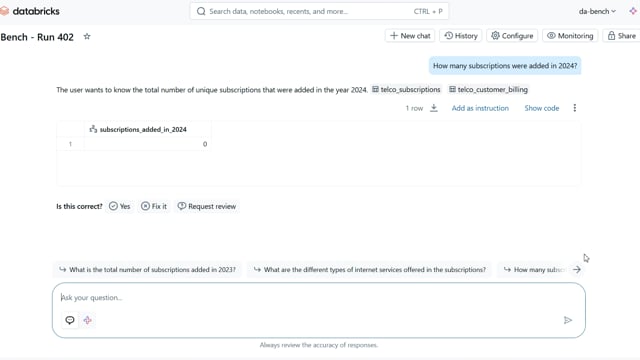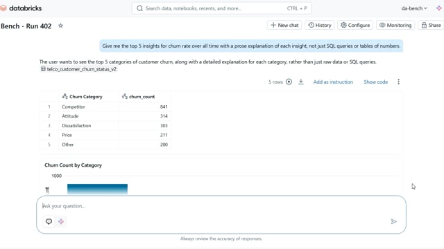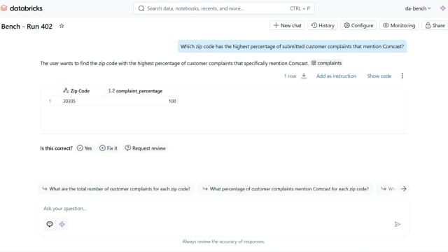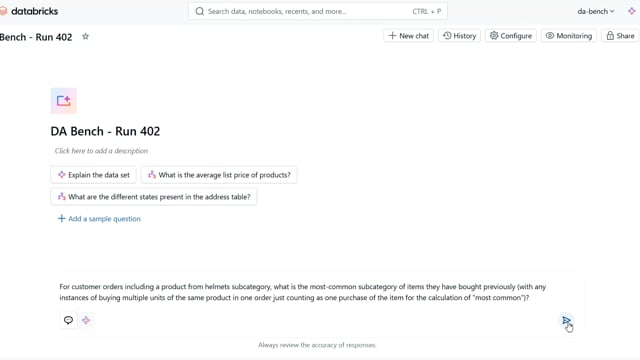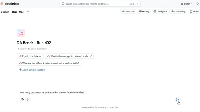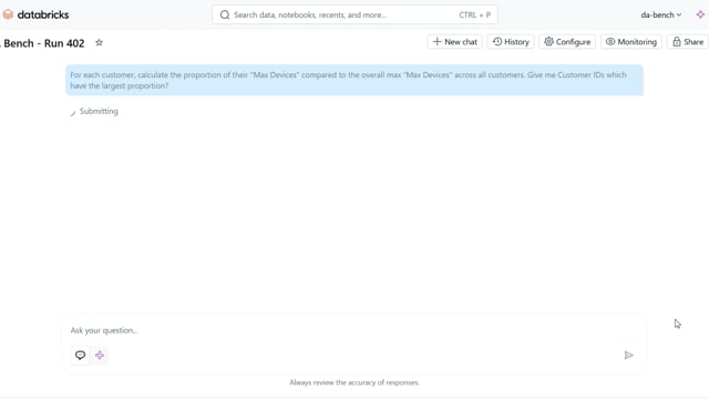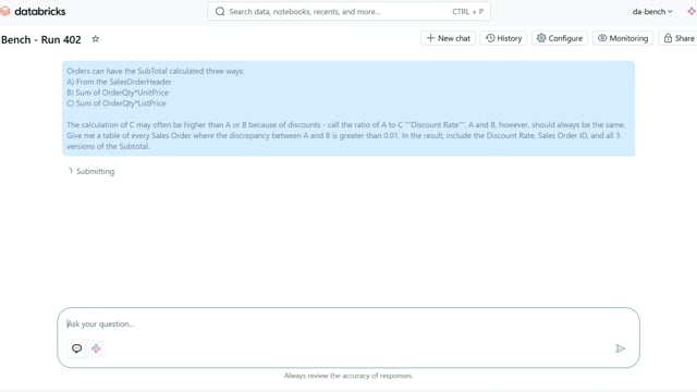 DA-bench Results for Run #402 — Test Score: 50.2% (158 / 315)