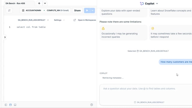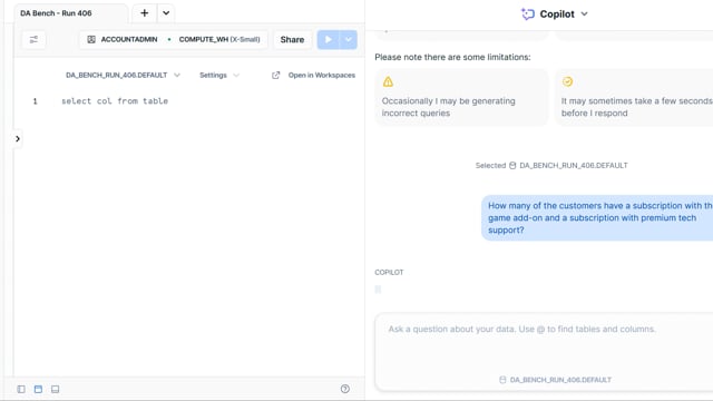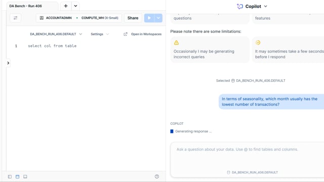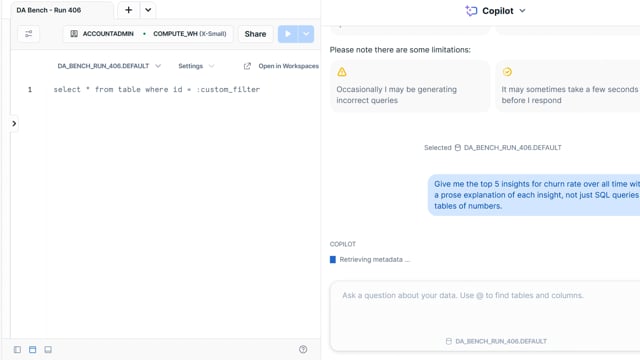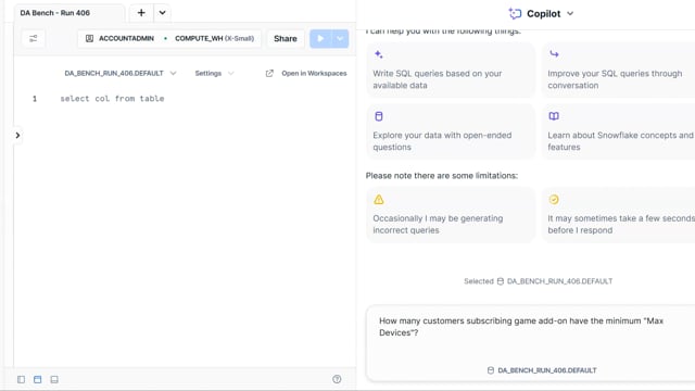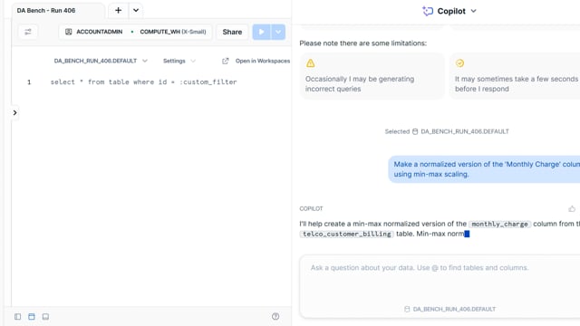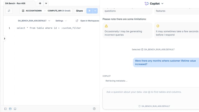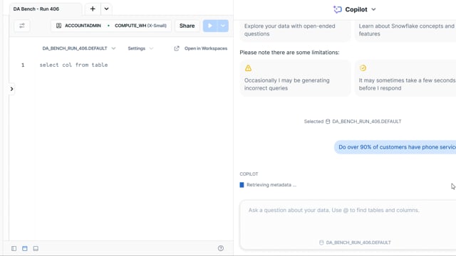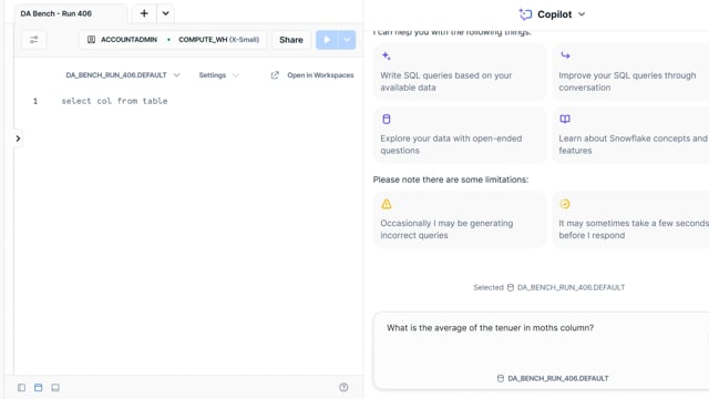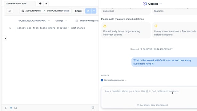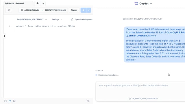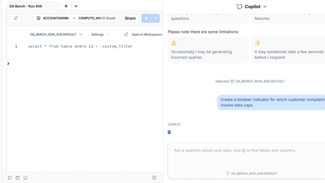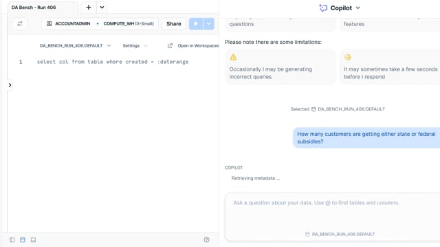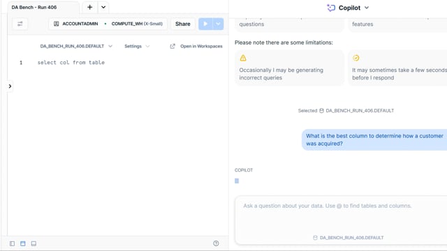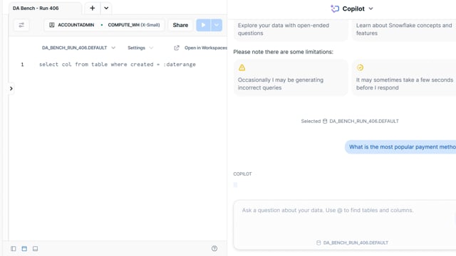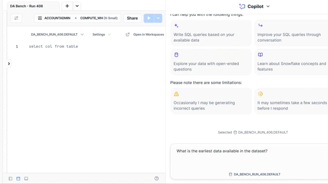 DA-bench Results for Run #406 — Test Score: 47.5% (152 / 320)