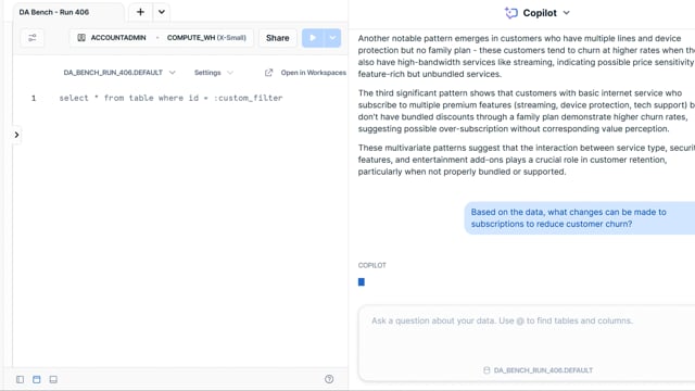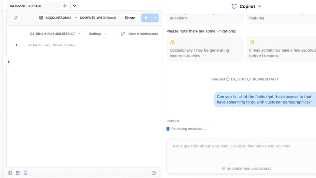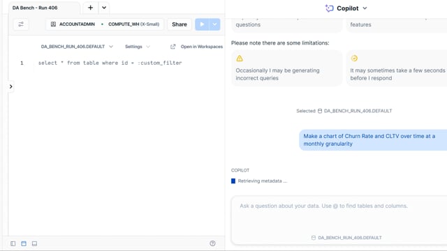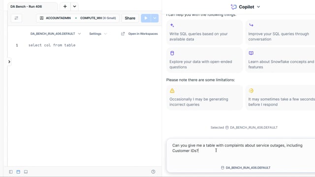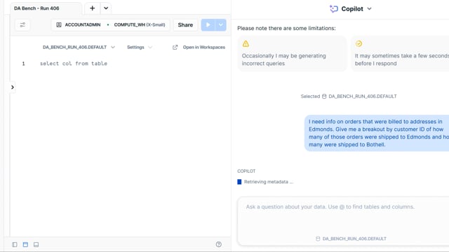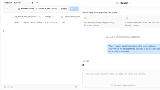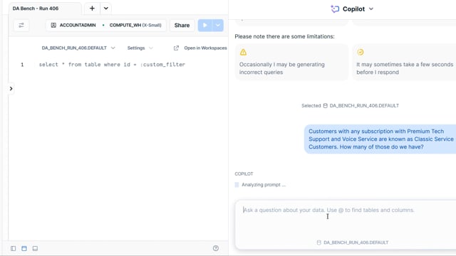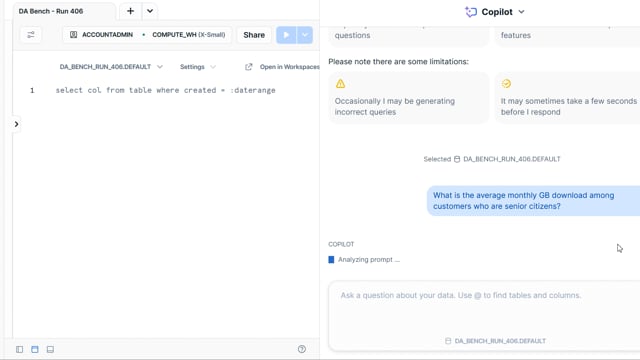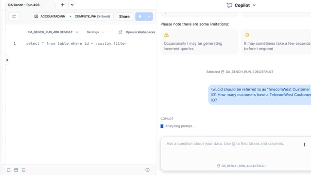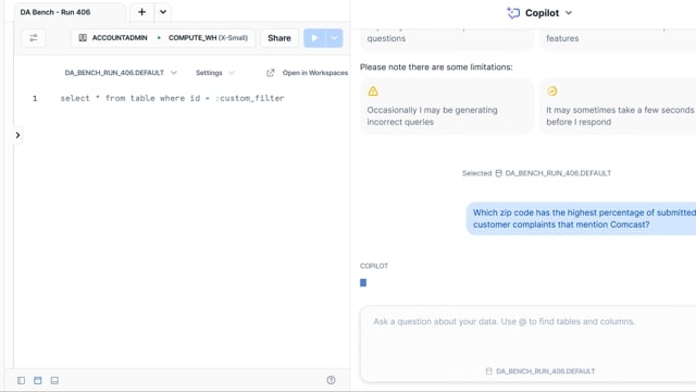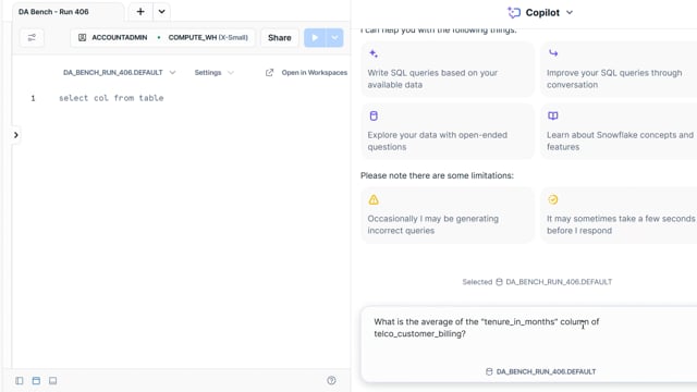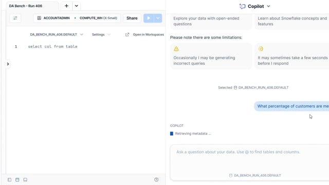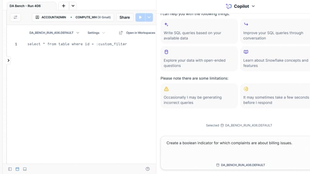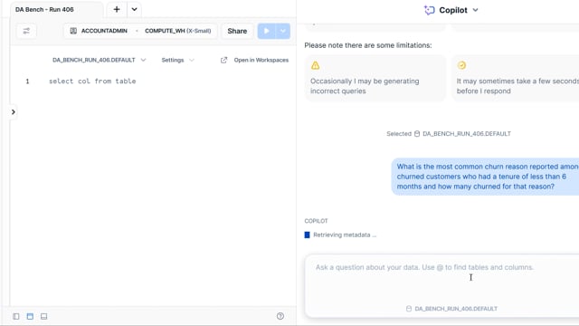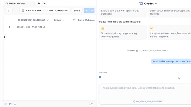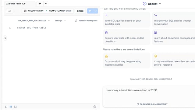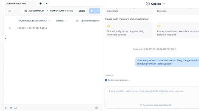 DA-bench Results for Run #406 — Test Score: 47.5% (152 / 320)