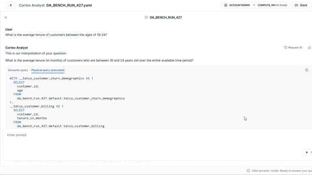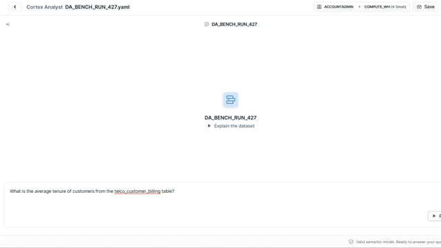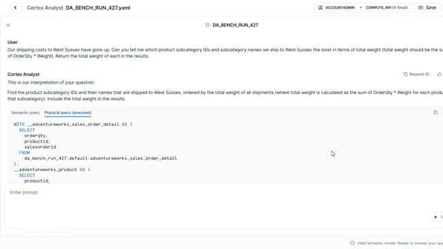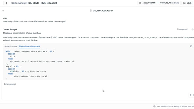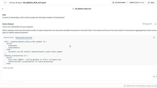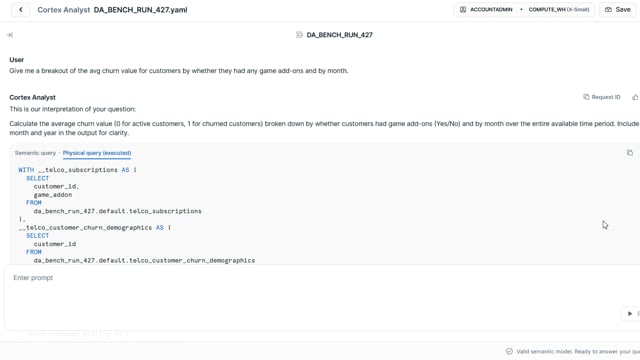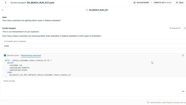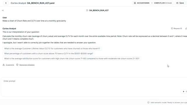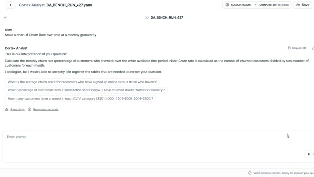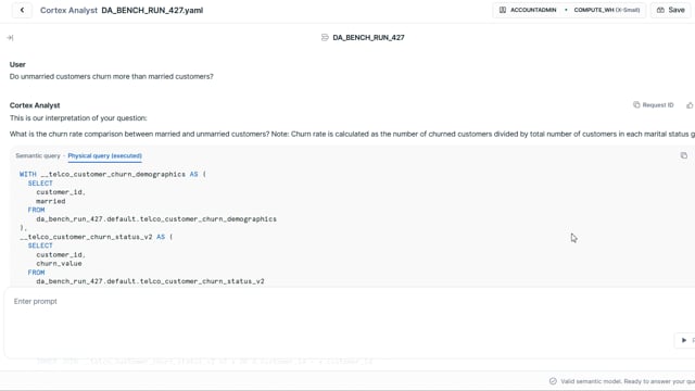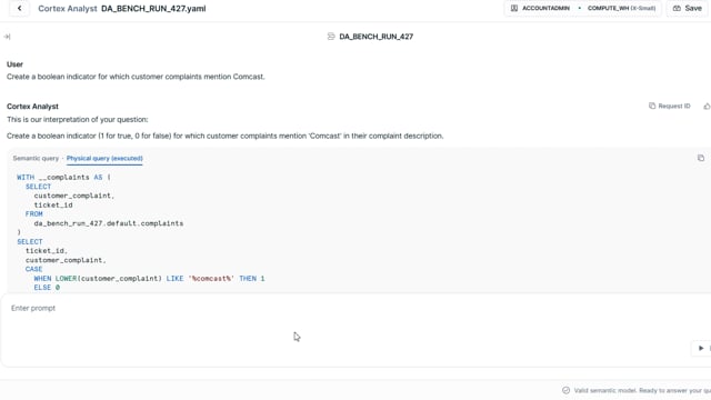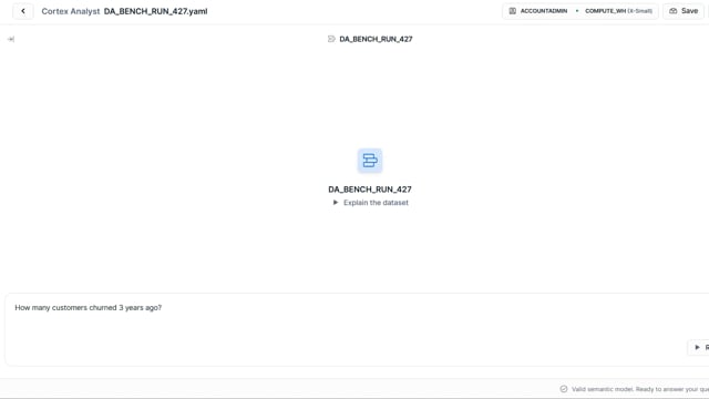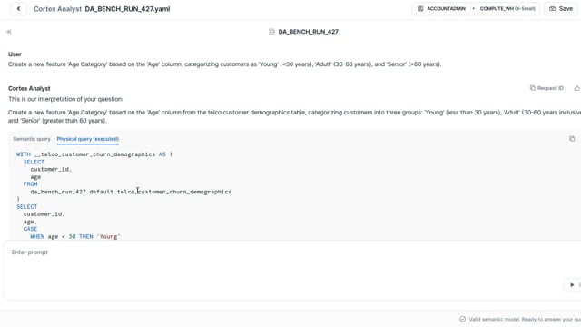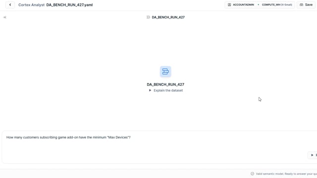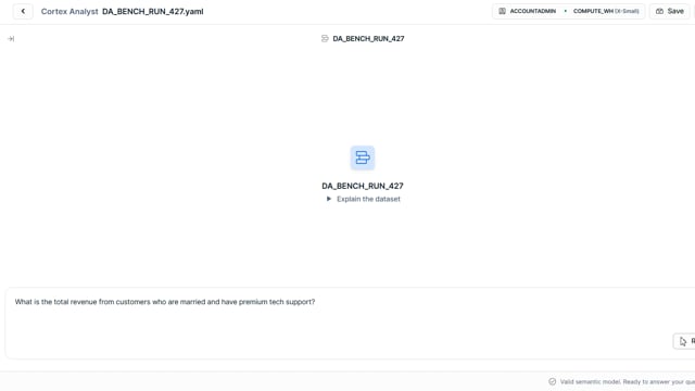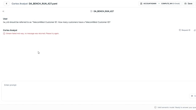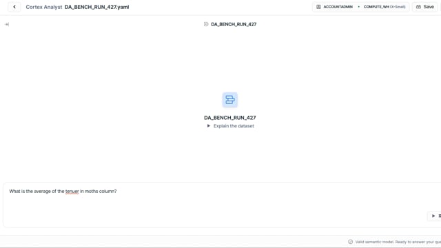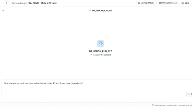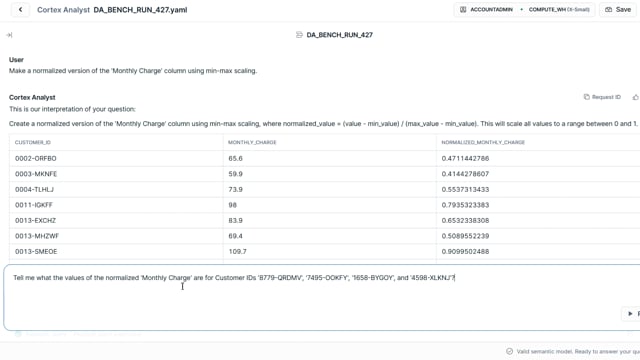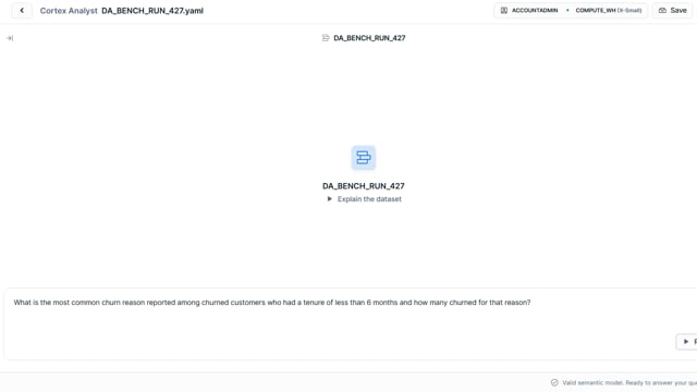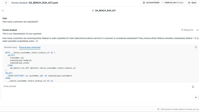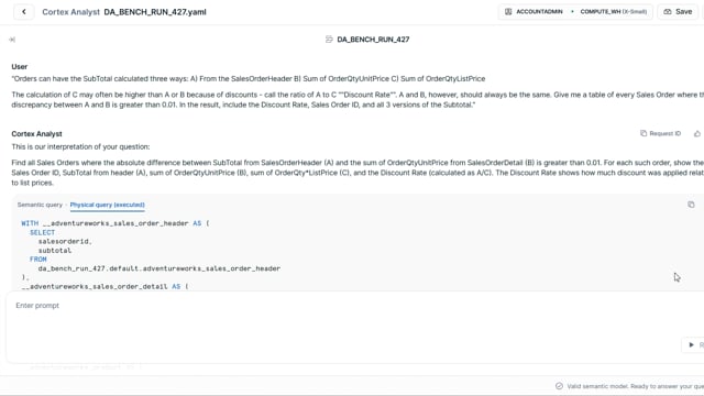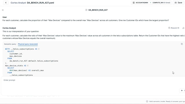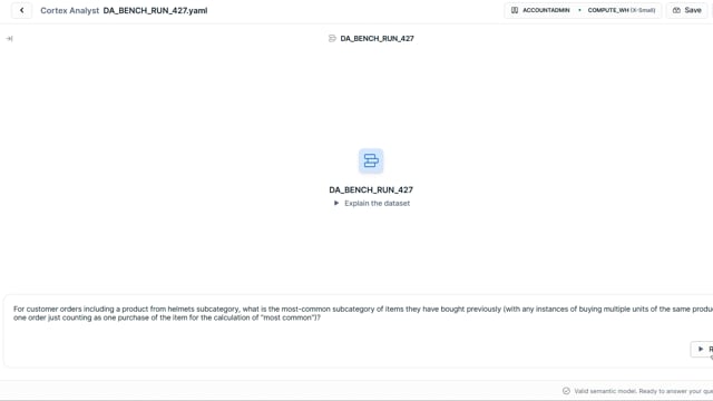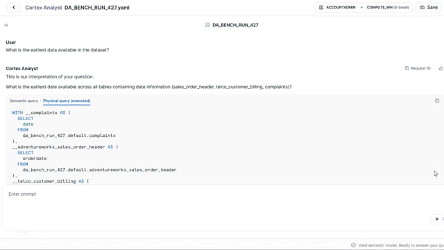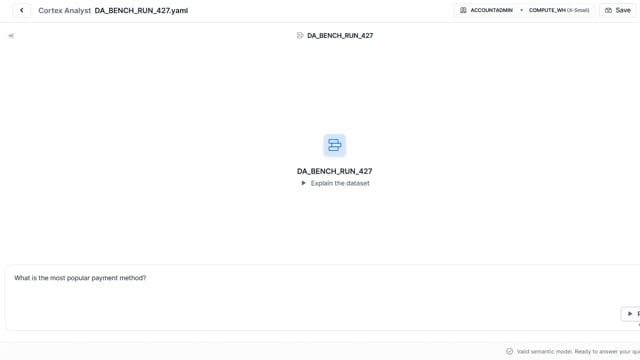 DA-bench Results for Run #427 — Test Score: 65.4% (206 / 315)